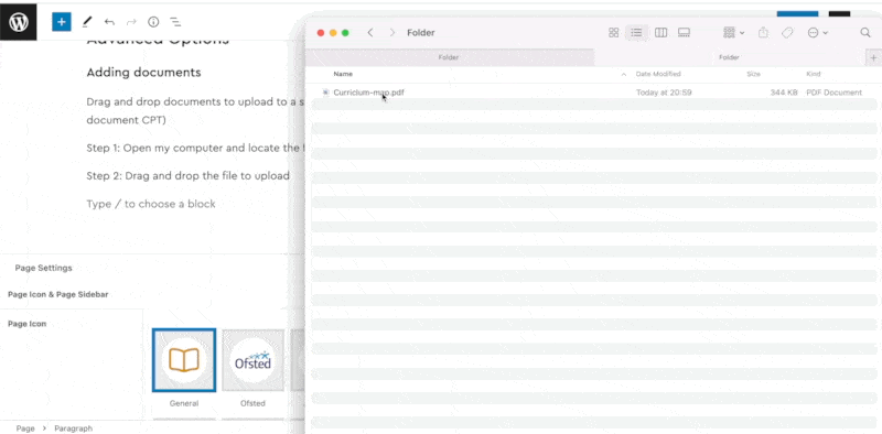 Drag and drop documents to upload to a standard page (Policies and letters are added through the new admin dropdown)