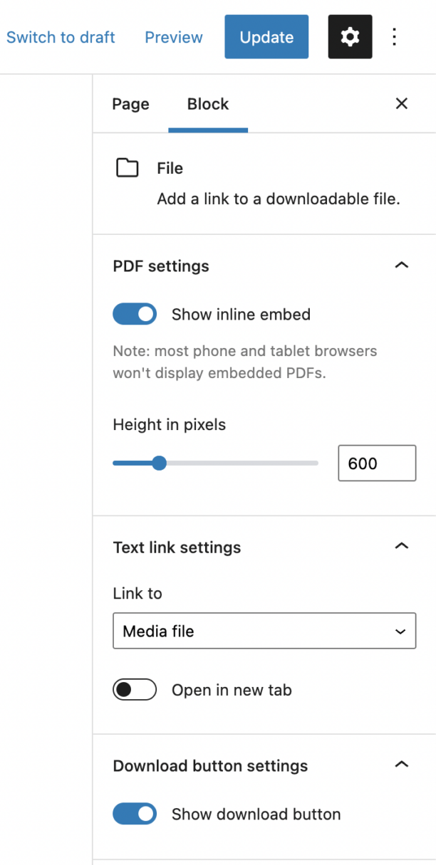 Step 4: Adjust the PDF preview height or toggle the inline embed to remove